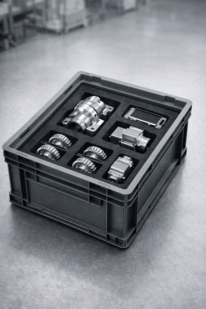 Standardlösungen stoßen hier oft an ihre Grenzen. Wir entwickeln für Sie Ladungsträger, die exakt auf Ihre Bauteilgeometrie und Ihre automatisierten Prozesse abgestimmt sind. Das Ergebnis ist eine maximale Packdichte bei gleichzeitigem Null-Fehler-Schutz. Wir kombinieren dabei die Stabilität von Kunststoff-Behältern mit der Millimeterarbeit individueller Inlays aus Schaumstoff oder Kunststoff, um für Sie eine Lösung zu schaffen, die Ihre Logistik nicht nur unterstützt, sondern aktiv beschleunigt.